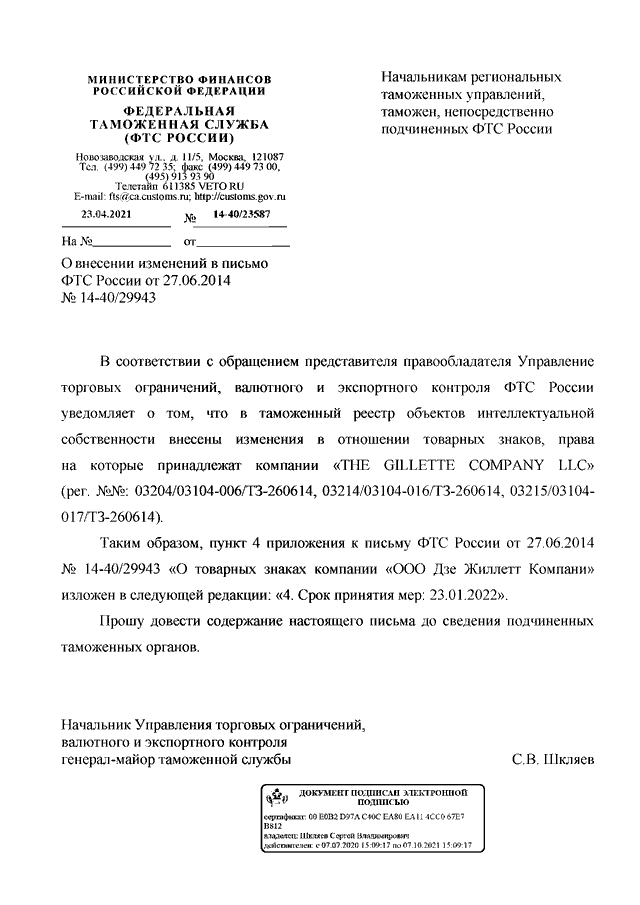 ПИСЬМО ФТС РФ от 23.04.2021 N 14-40/23587