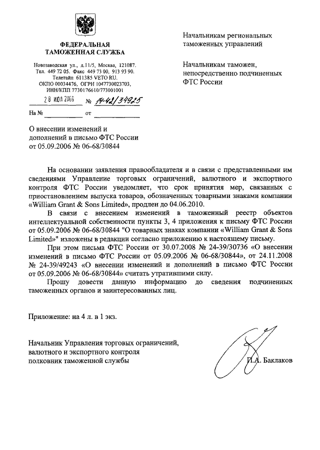 "О ВНЕСЕНИИ ИЗМЕНЕНИЙ И ДОПОЛНЕНИЙ В ПИСЬМО ФТС РОССИИ ОТ 05.09.2006 N 06-68/30844"