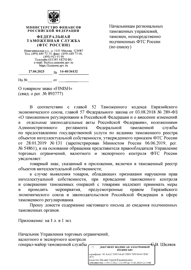 ПИСЬМО ФТС РФ от 27.06.2023 N 14-40/36132