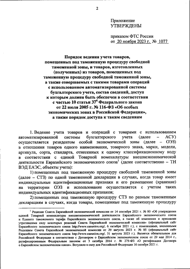 ПРИКАЗ ФТС РФ от 20.11.2023 N 1077 "ОБ УТВЕРЖДЕНИИ ПОРЯДКА ВЕДЕНИЯ УЧЕТА ТОВАРОВ, ПОМЕЩЕННЫХ ПОД