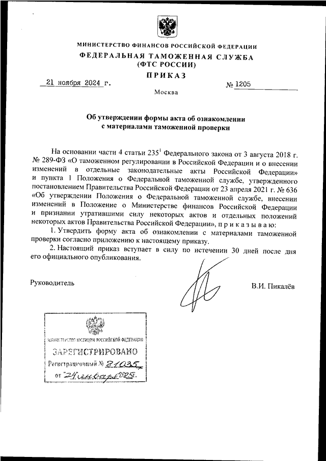 ПРИКАЗ ФТС РФ от 21.11.2024 N 1205