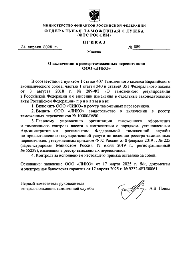 ПРИКАЗ ФТС РФ от 24.04.2025 N 389