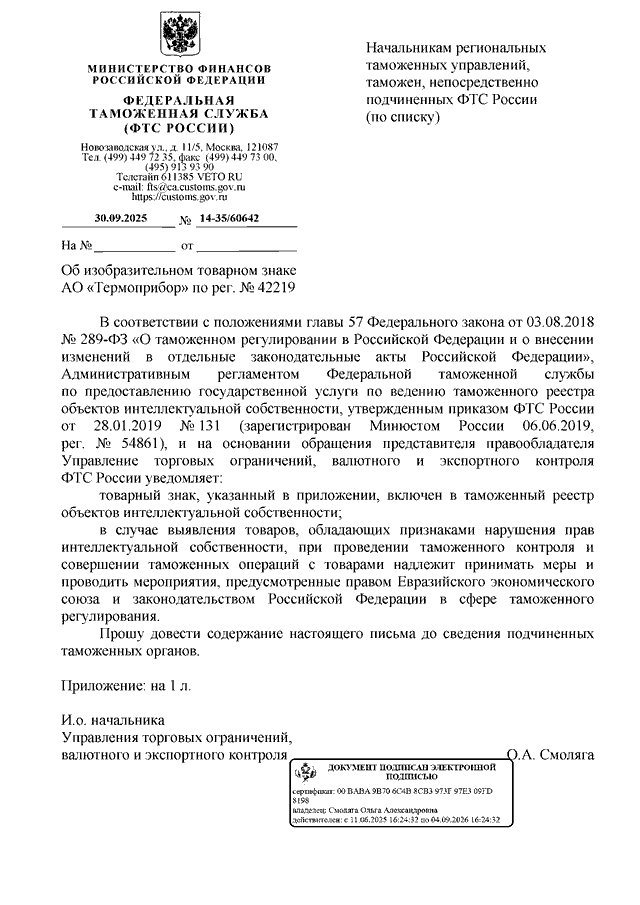 ПИСЬМО ФТС РФ от 30.09.2025 N 14-35/60642