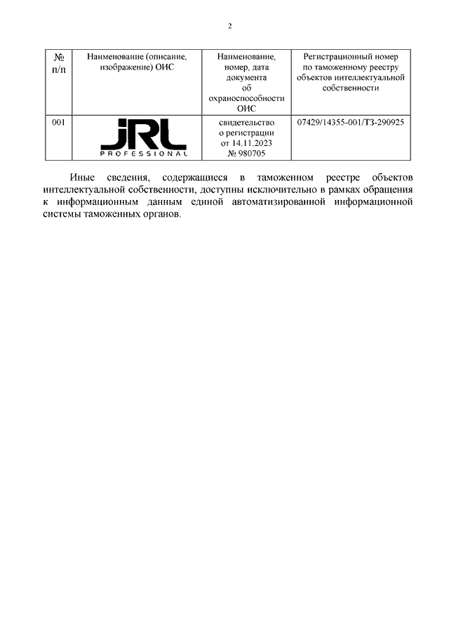 "О ТОВАРНОМ ЗНАКЕ "JRI. PROFESSIONAL" ПО РЕГ. N 980705"