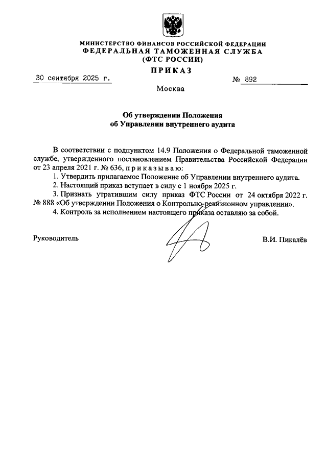 ПРИКАЗ ФТС РФ от 30.09.2025 N 892