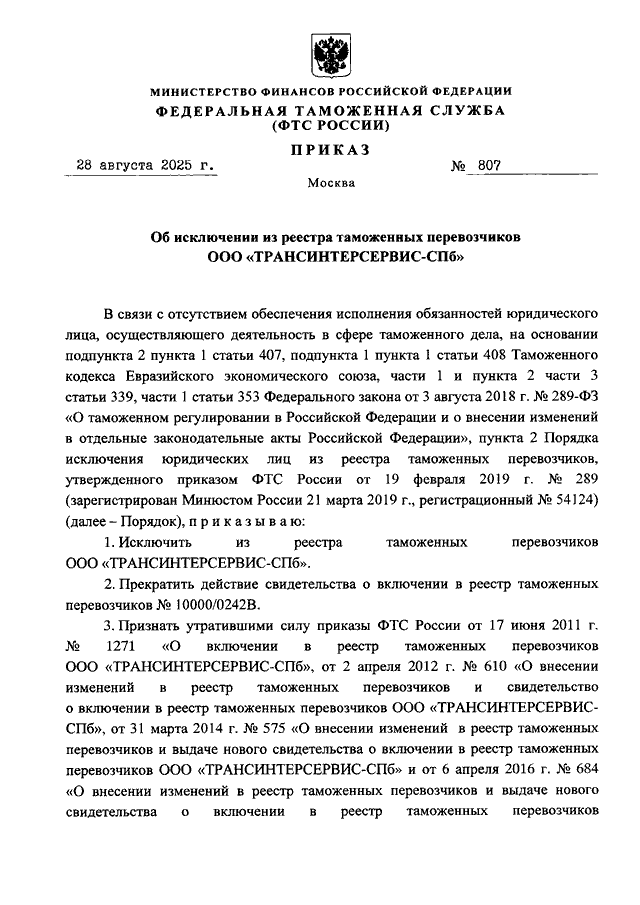 ПРИКАЗ ФТС РФ от 28.08.2025 N 807