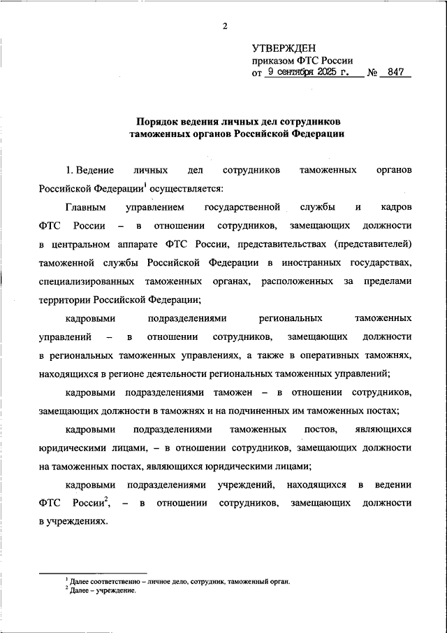 ПРИКАЗ ФТС РФ от 09.09.2025 N 847