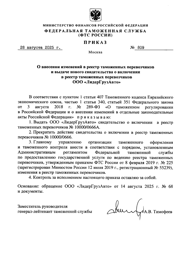 ПРИКАЗ ФТС РФ от 28.08.2025 N 809