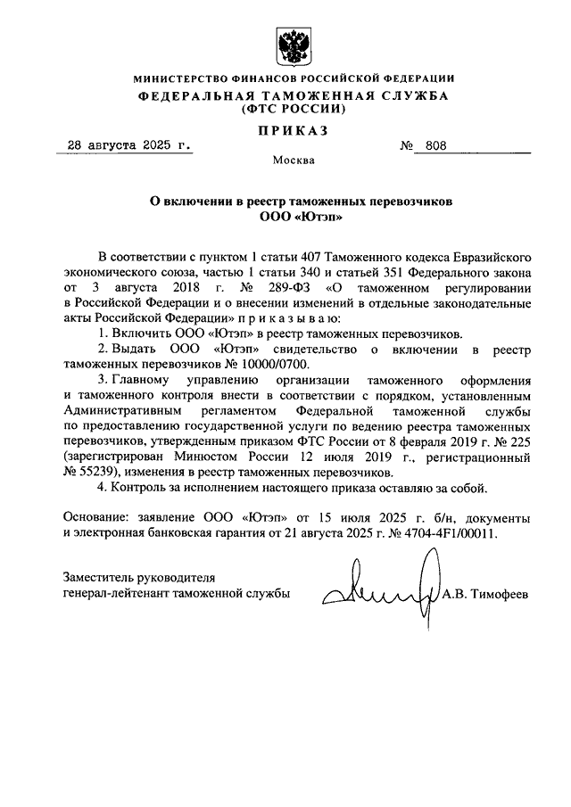 ПРИКАЗ ФТС РФ от 28.08.2025 N 808