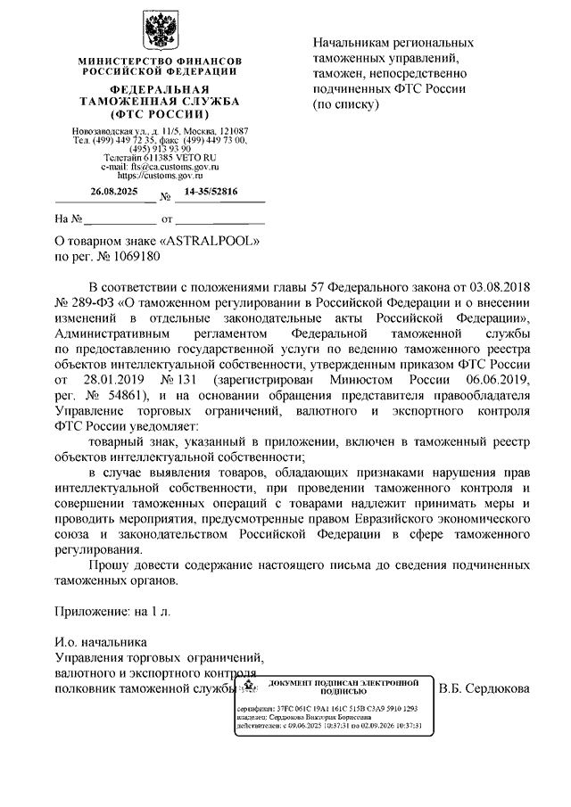 ПИСЬМО ФТС РФ от 26.08.2025 N 14-35/52816