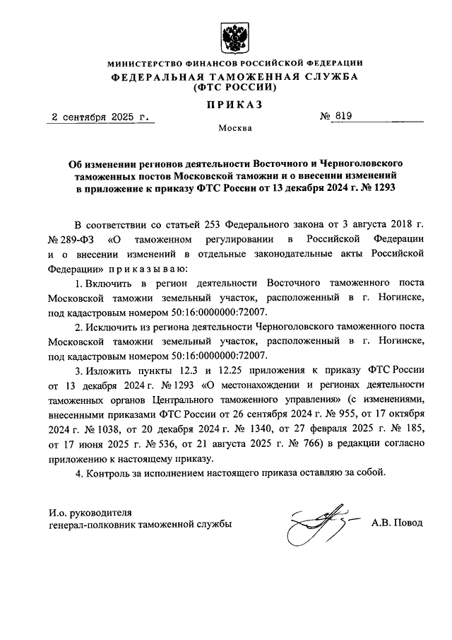 "ОБ ИЗМЕНЕНИИ РЕГИОНОВ ДЕЯТЕЛЬНОСТИ ВОСТОЧНОГО И ЧЕРНОГОЛОВСКОГО ТАМОЖЕННЫХ ПОСТОВ МОСКОВСКОЙ ТАМОЖНИ И О ВНЕСЕНИИ ИЗМЕНЕНИЙ В ПРИЛОЖЕНИЕ К ПРИКАЗУ ФТС РОССИИ ОТ 13 ДЕКАБРЯ 2024 Г. N 1293"