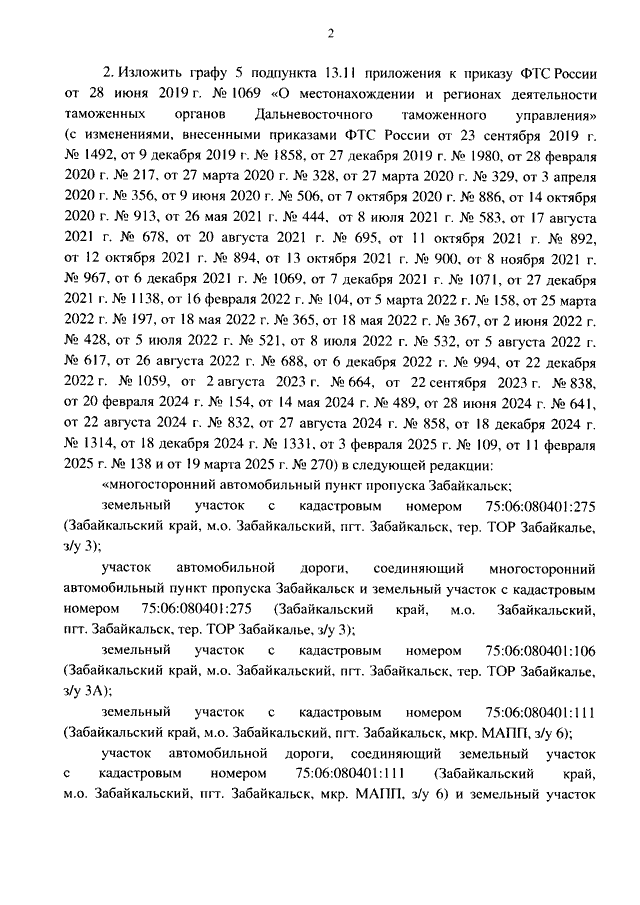 "ОБ ОПРЕДЕЛЕНИИ РЕГИОНА ДЕЯТЕЛЬНОСТИ ТАМОЖЕННОГО ПОСТА МАПП ЗАБАЙКАЛЬСК ЧИТИНСКОЙ ТАМОЖНИ И О ВНЕСЕНИИ ИЗМЕНЕНИЯ В ПРИЛОЖЕНИЕ К ПРИКАЗУ ФТС РОССИИ ОТ 28 ИЮНЯ 2019 Г. N 1069"