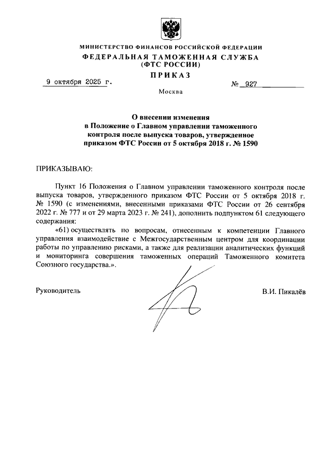 ПРИКАЗ ФТС РФ от 09.10.2025 N 927