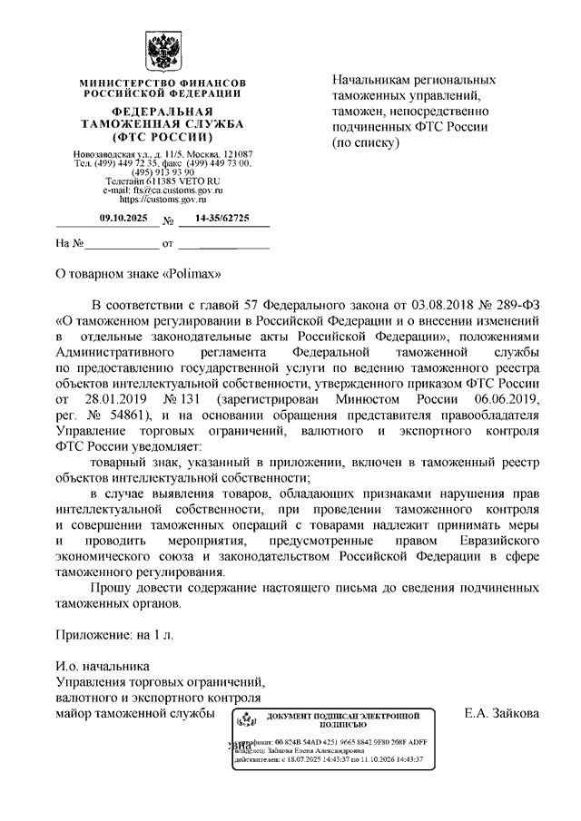 ПИСЬМО ФТС РФ от 09.10.2025 N 14-35/62725