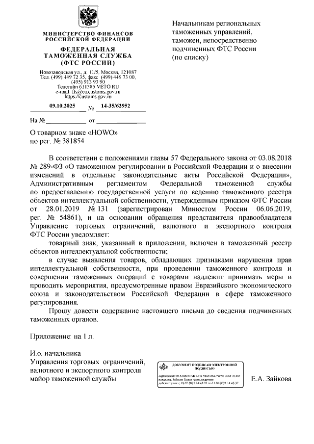 ПИСЬМО ФТС РФ от 09.10.2025 N 14-35/62952