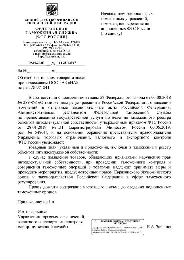 ПИСЬМО ФТС РФ от 09.10.2025 N 14-35/62947