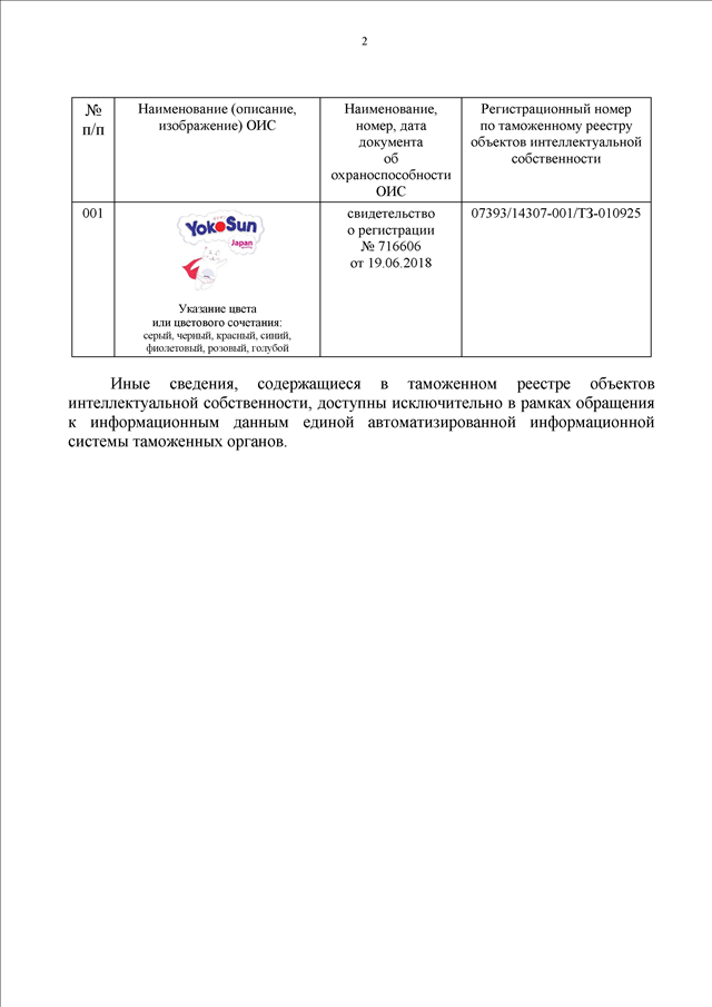 "О ТОВАРНОМ ЗНАКЕ "YOKOSUN" ПО РЕГ. N 716606"