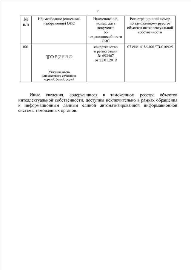 "О ТОВАРНОМ ЗНАКЕ "TOPZERO" ПО РЕГ. N 693467"