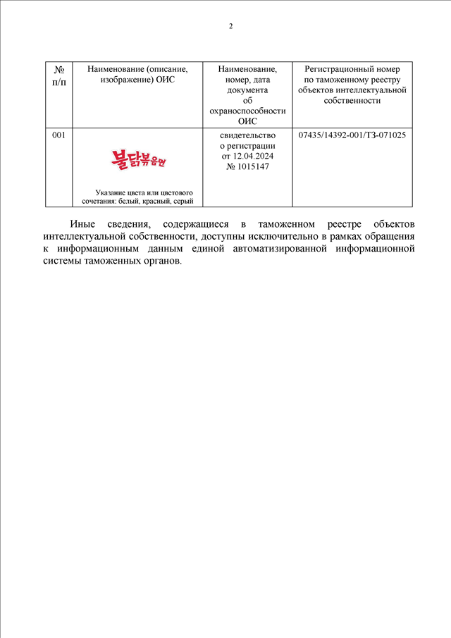 "О ТОВАРНОМ ЗНАКЕ "SAMYANG FOODS INC" ПО РЕГ. N 1015147"