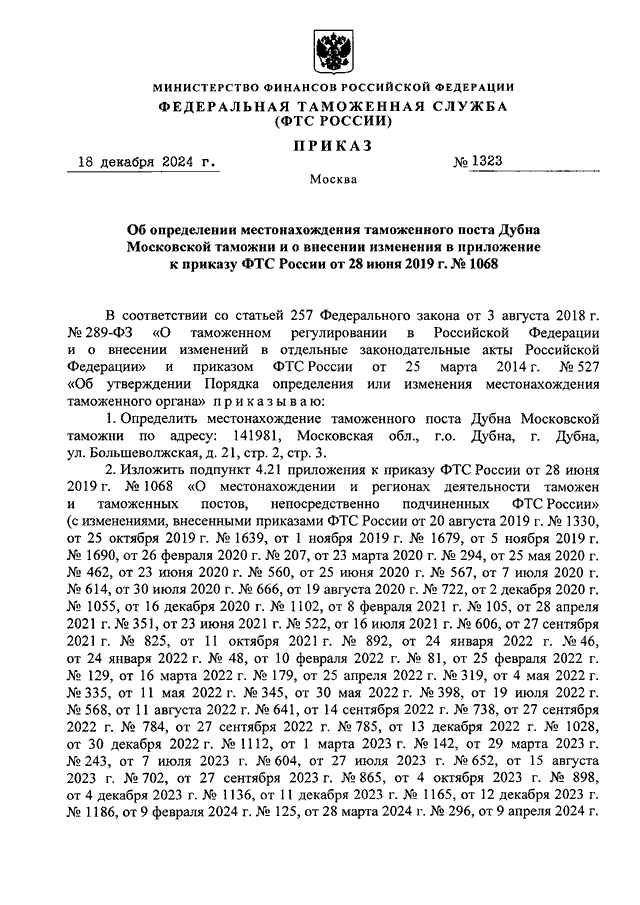 "ОБ ОПРЕДЕЛЕНИИ МЕСТОНАХОЖДЕНИЯ ТАМОЖЕННОГО ПОСТА ДУБНА МОСКОВСКОЙ ТАМОЖНИ И О ВНЕСЕНИИ ИЗМЕНЕНИЯ В ПРИЛОЖЕНИЕ К ПРИКАЗУ ФТС РОССИИ ОТ 28 ИЮНЯ 2019 Г. N 1068"