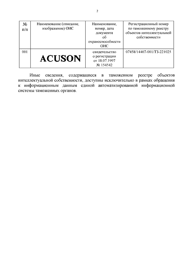 "О ТОВАРНОМ ЗНАКЕ "ACUSON" ПО РЕГ. N 154542"