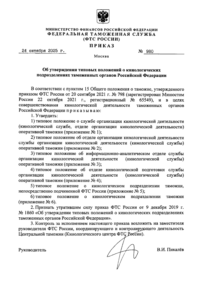 ПРИКАЗ ФТС РФ от 24.10.2025 N 980