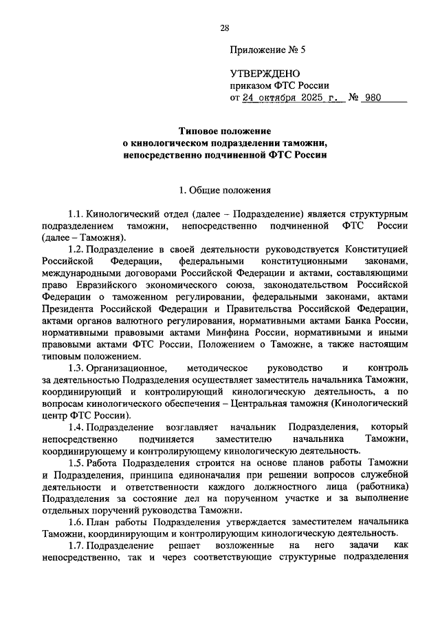ПРИКАЗ ФТС РФ от 24.10.2025 N 980