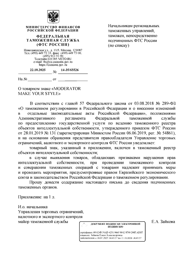 ПИСЬМО ФТС РФ от 22.10.2025 N 14-35/65526