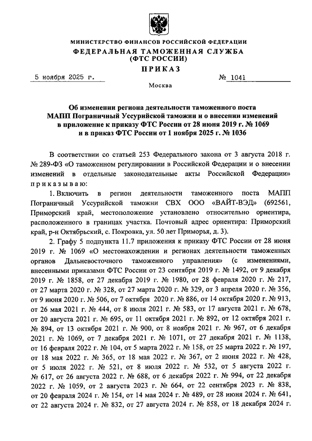 ПРИКАЗ ФТС РФ от 05.11.2025 N 1041 "ОБ ИЗМЕНЕНИИ РЕГИОНА ДЕЯТЕЛЬНОСТИ ТАМОЖЕННОГО ПОСТА МАПП