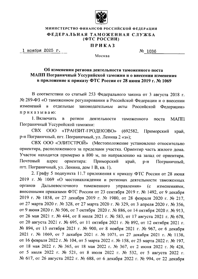 ПРИКАЗ ФТС РФ от 01.11.2025 N 1036