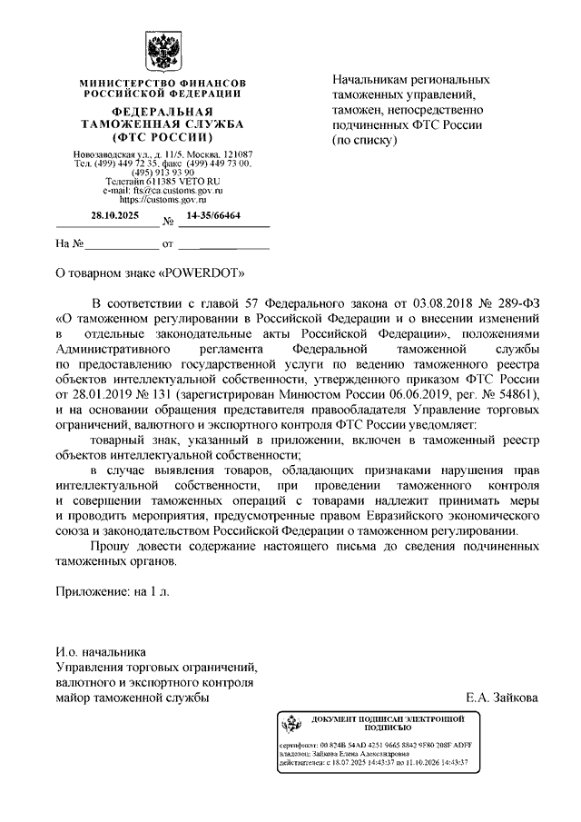 ПИСЬМО ФТС РФ от 28.10.2025 N 14-35/66464