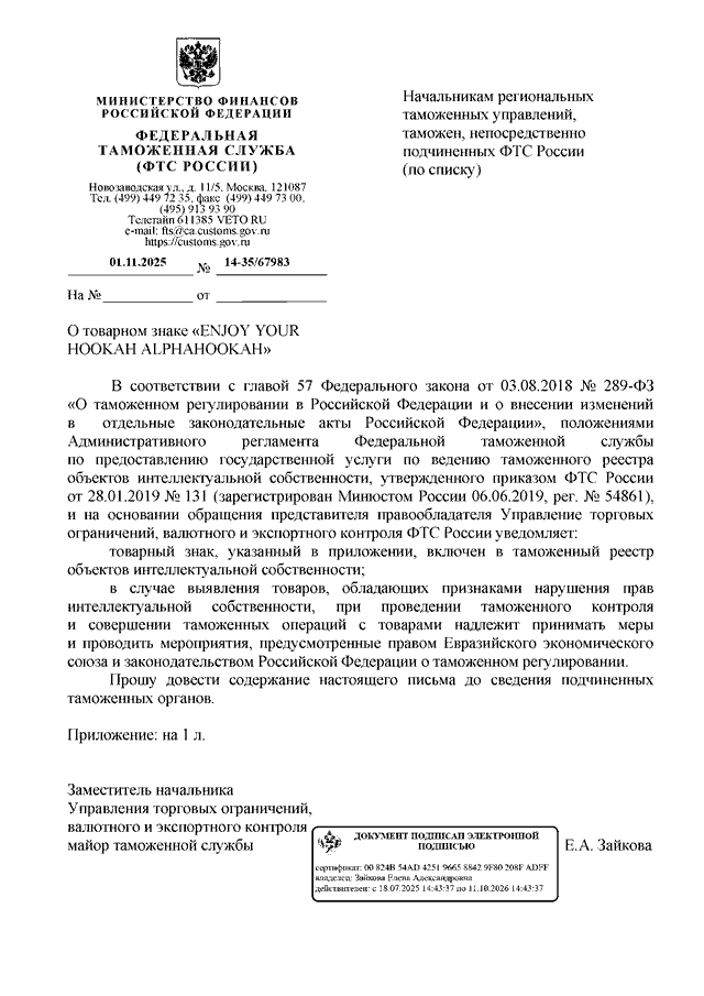 ПИСЬМО ФТС РФ от 01.11.2025 N 14-35/67983