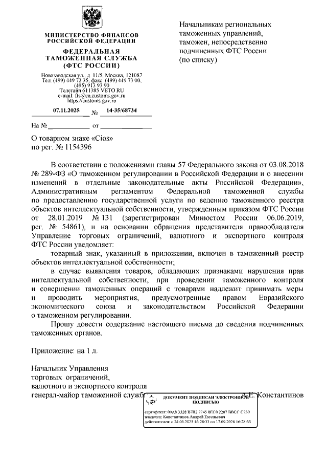ПИСЬМО ФТС РФ от 07.11.2025 N 14-35/68734