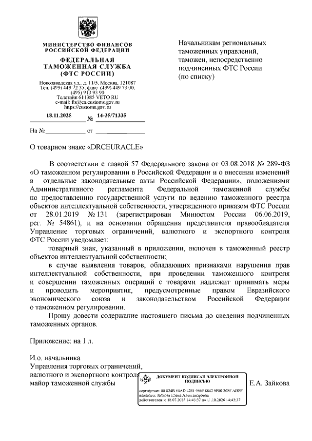 ПИСЬМО ФТС РФ от 18.11.2025 N 14-35/71335