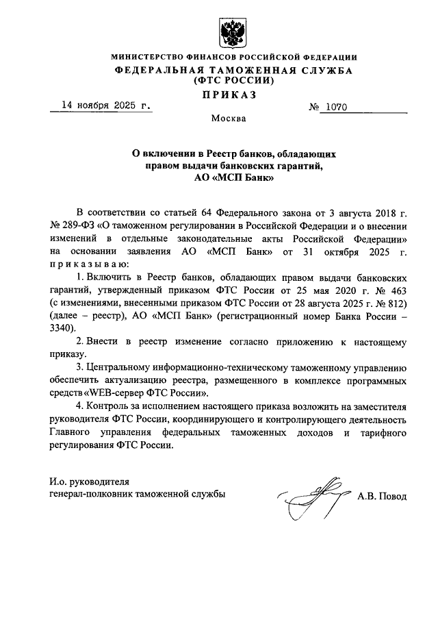 ПРИКАЗ ФТС РФ от 14.11.2025 N 1070