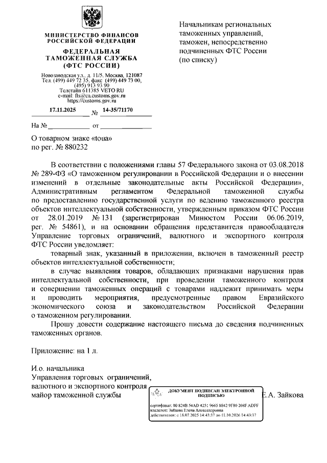 ПИСЬМО ФТС РФ от 17.11.2025 N 14-35/71170