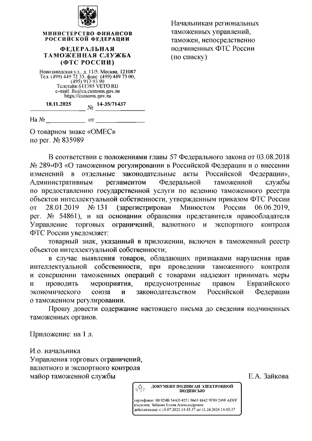 ПИСЬМО ФТС РФ от 18.11.2025 N 14-35/71437
