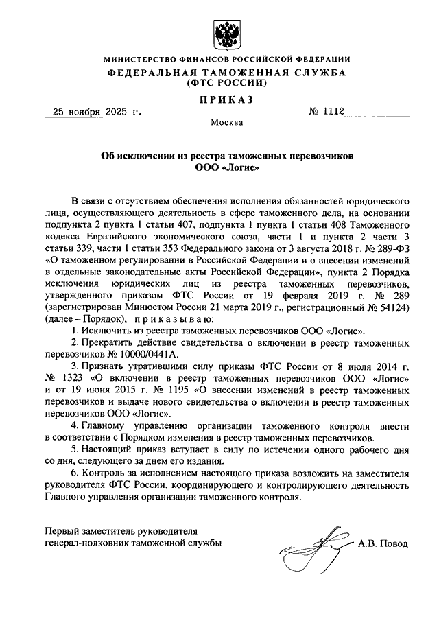 ПРИКАЗ ФТС РФ от 25.11.2025 N 1112