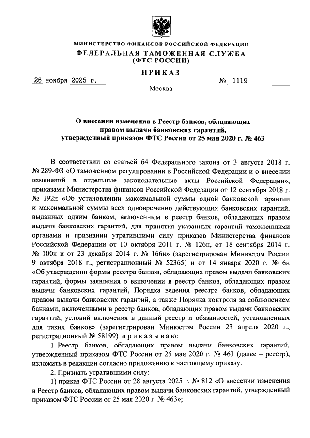 ПРИКАЗ ФТС РФ от 26.11.2025 N 1119