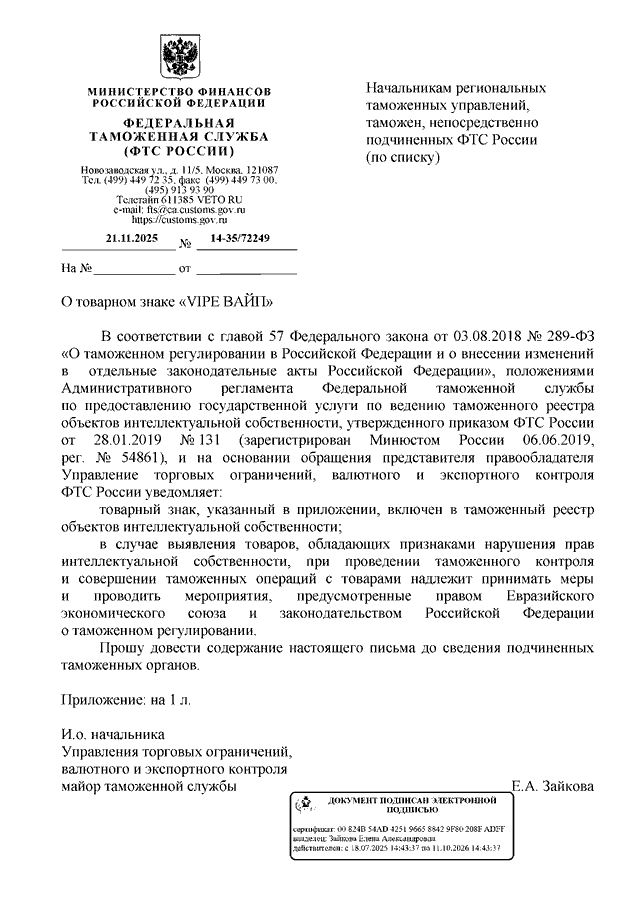 ПИСЬМО ФТС РФ от 21.11.2025 N 14-35/72249