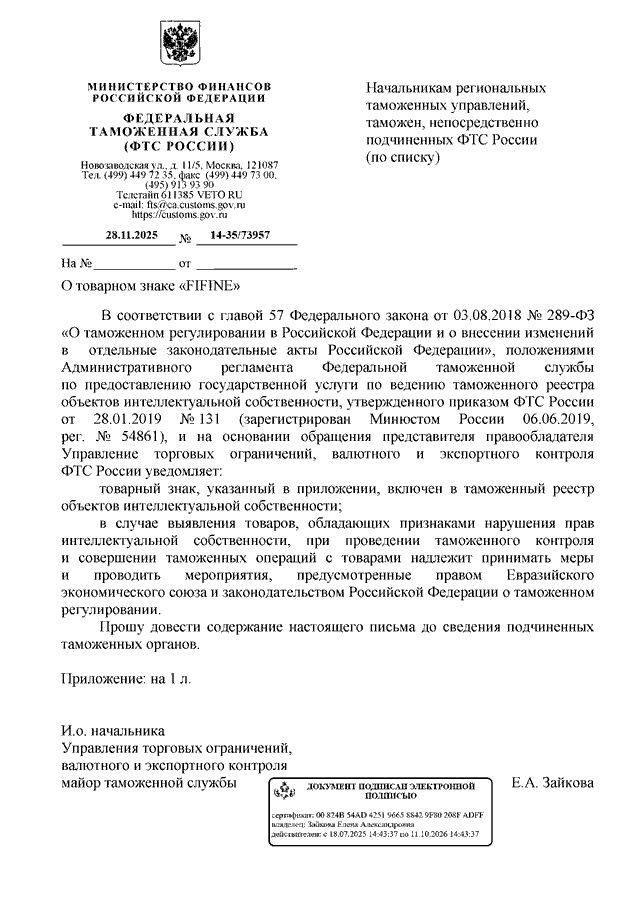 ПИСЬМО ФТС РФ от 28.11.2025 N 14-35/73957