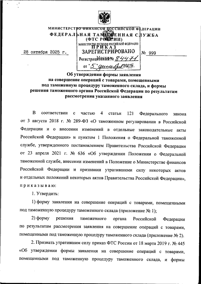 ПРИКАЗ ФТС РФ от 28.10.2025 N 999 "ОБ УТВЕРЖДЕНИИ ФОРМЫ ЗАЯВЛЕНИЯ НА СОВЕРШЕНИЕ ОПЕРАЦИЙ С ТОВАРАМИ,