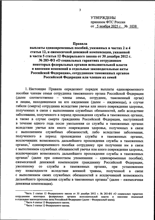 ПРИКАЗ ФТС РФ от 05.11.2025 N 1038