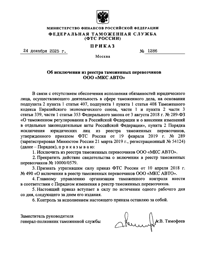 ПРИКАЗ ФТС РФ от 24.12.2025 N 1286