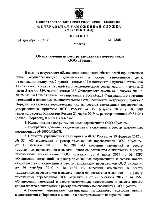 ПРИКАЗ ФТС РФ от 24.12.2025 N 1285