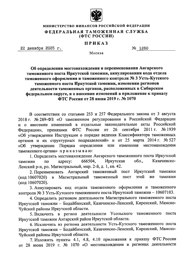 ПРИКАЗ ФТС РФ от 22.12.2025 N 1260 "ОБ ОПРЕДЕЛЕНИИ МЕСТОНАХОЖДЕНИЯ И ПЕРЕИМЕНОВАНИИ АНГАРСКОГО