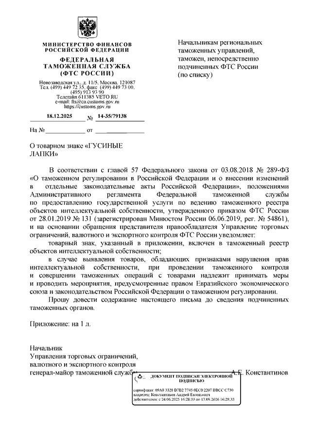 ПИСЬМО ФТС РФ от 18.12.2025 N 14-35/79138