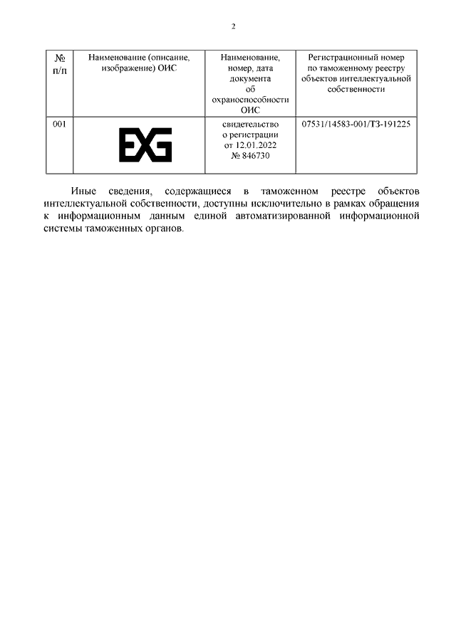 "О ТОВАРНОМ ЗНАКЕ "EXG" ПО РЕГ. N 846730"