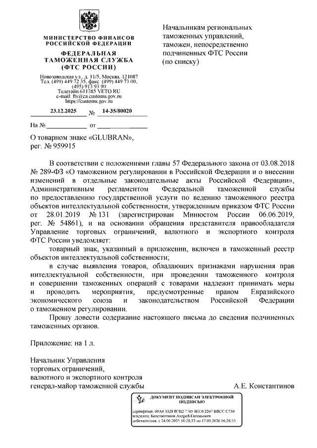 ПИСЬМО ФТС РФ от 23.12.2025 N 14-35/80020
