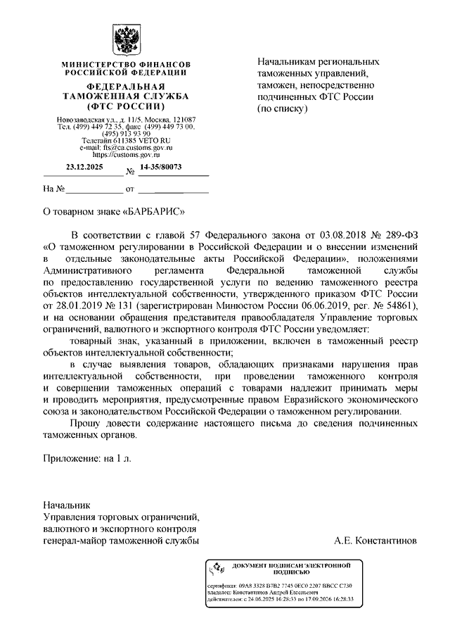 ПИСЬМО ФТС РФ от 23.12.2025 N 14-35/80073